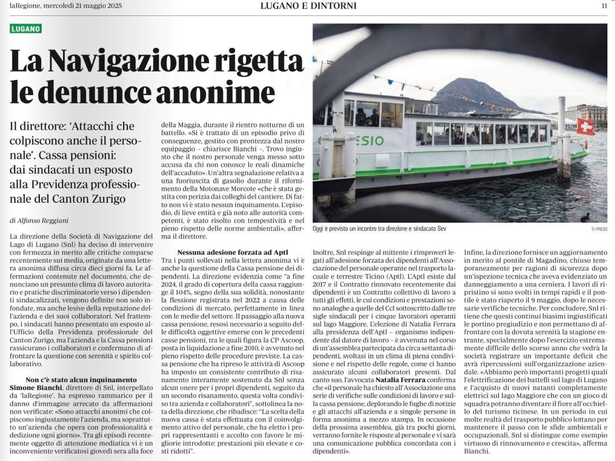 A seguito di un sopralluogo effettuato il 18 marzo da un rinomato studio di ingegneria del Locarnese, incaricato da SNL nell’ambito delle consuete procedure previste dalla normativa vigente, sono emerse alcune criticità strutturali al pontile di Magadino. Il pontile, utilizzato dai battelli di SNL sia per i servizi turistici sia per la linea di trasporto pubblico 351 Locarno (– Tenero) – Magadino, è dotato di un sistema di adattamento al livello del lago tramite quattro cerniere. Durante l’ispezione è stato rilevato il danneggiamento di una di queste componenti. I tecnici di SNL sono intervenuti tempestivamente, effettuando i rilievi necessari e ordinando i pezzi di ricambio. I lavori di ripristino erano stati pianificati per concludersi prima dell’inizio della stagione estiva. A causa di un ritardo nella fabbricazione delle nuove cerniere, per motivi di sicurezza, SNL ha disposto la chiusura cautelativa del pontile a partire dal 17 aprile. I lavori di sostituzione di tutte e quattro le cerniere, accompagnati da ulteriori interventi di manutenzione straordinaria, si sono conclusi positivamente nei giorni scorsi. A seguito delle verifiche finali, lo Studio di ingegneria citato in precedenza ha rilasciato ieri pomeriggio il nullaosta, confermando la qualità degli interventi eseguiti e certificando la sicurezza del pontile. Il pontile di Magadino è quindi di nuovo agibile e sarà riaperto al pubblico venerdì 9 maggio. La Comunità Tariffale Arcobaleno è stata debitamente informata e collaborerà con SNL nella comunicazione del ripristino della piena operatività della struttura. SNL è spiacente per i disagi involontariamente arrecati e desidera ringraziare l’utenza per la comprensione e la pazienza dimostrate. Ufficio StampaSocietà Navigazione del Lago di Lugano SA